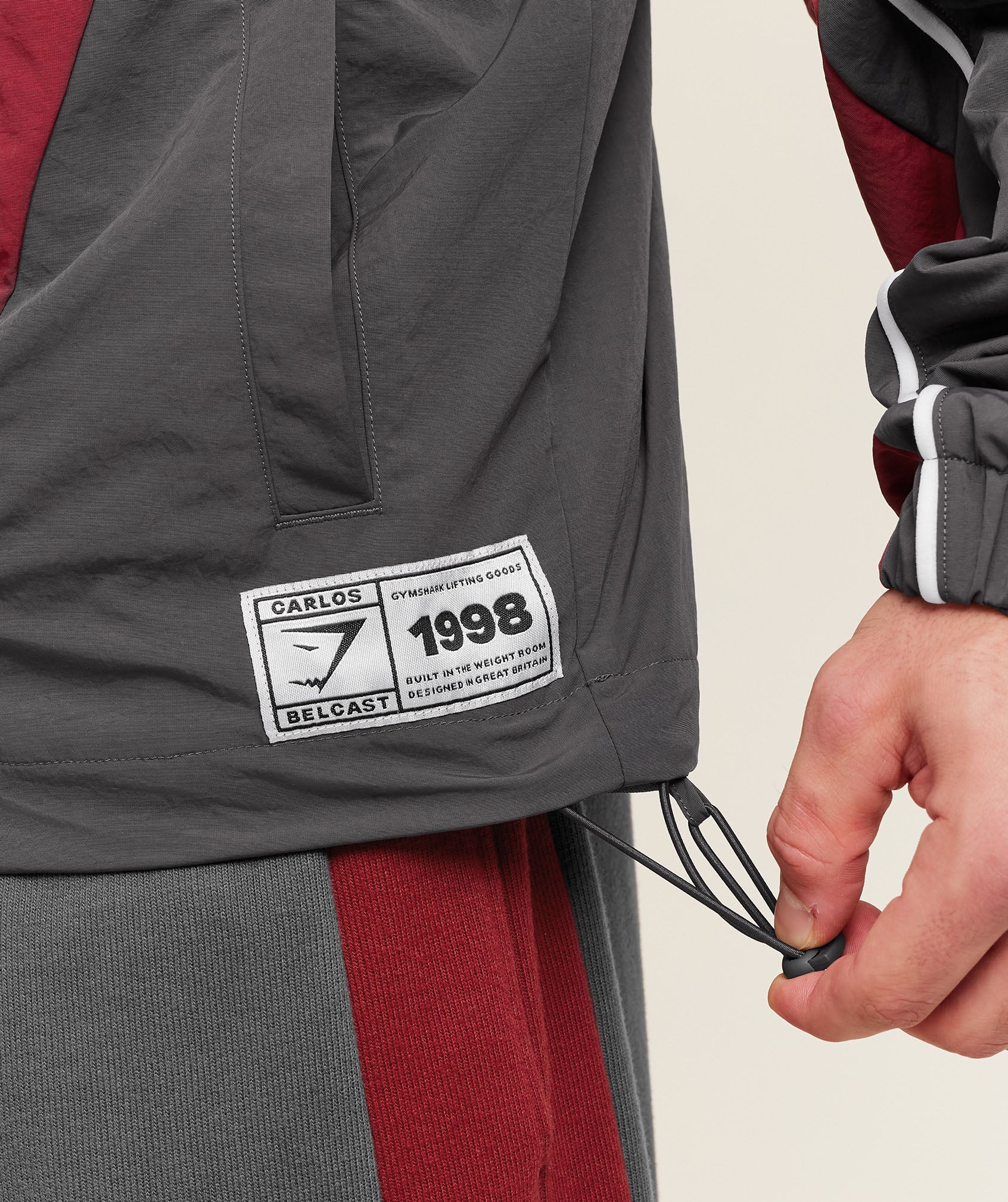 Designed for easy layering with an oversized fit, featuring contrast panels, a high neck to lock in warmth, a bungee hem for a custom shape, popper pockets, and an exclusive Carlos Belcast patch.